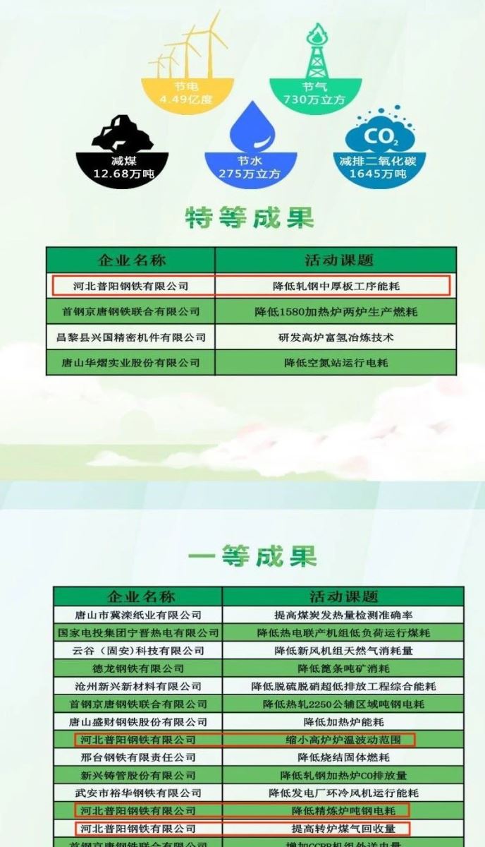 ? ? ? 本次征集活動,堅持全員參與、注重實效、促進交流的原則,采用自主申報、推薦等方式,共征集業(yè)績成果169項,主要涉及節(jié)能、節(jié)水、二氧化碳和重點污染物減排等方面,經行業(yè)專家評審,評出特等成果4項,一等成果30項,二等成果45項。其中,河北普陽鋼鐵有限公司(以下簡稱“普陽”)提交的降低軋鋼中厚板工序能耗課題獲評特等成果,縮小高爐爐溫波動范圍、降低精煉爐噸鋼電耗以及提高轉爐煤氣回收量3項課題被評為一等成果。據(jù)不完全統(tǒng)計,本次評定的成果應用經濟效益可達3.63億元/年。年節(jié)電4.49億kWh、節(jié)氣730萬m3、減煤12.68萬t、壓采地下水275萬m3、減排CO21645萬噸,大幅削減重點污染物排放。