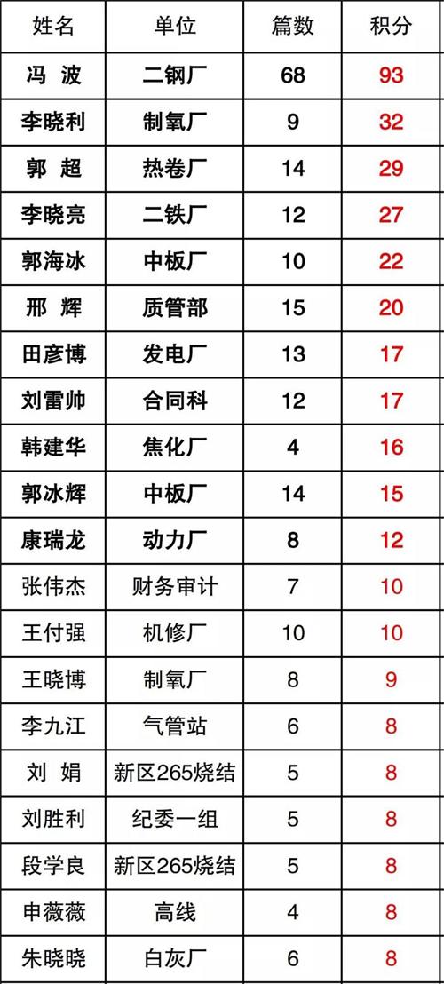 出,普陽煉鋼廠、制氧廠、熱卷廠、中普煉鐵廠、中板廠、質管部、發(fā)電廠、合同科、焦化廠、動力廠等單位在企業(yè)文宣方面重視力度較高,特別是普陽煉鋼廠,通過有力的組織激勵措施,發(fā)動廣大工友積極投稿,通過集體的力量,高居積分榜首,值得各廠借鑒。