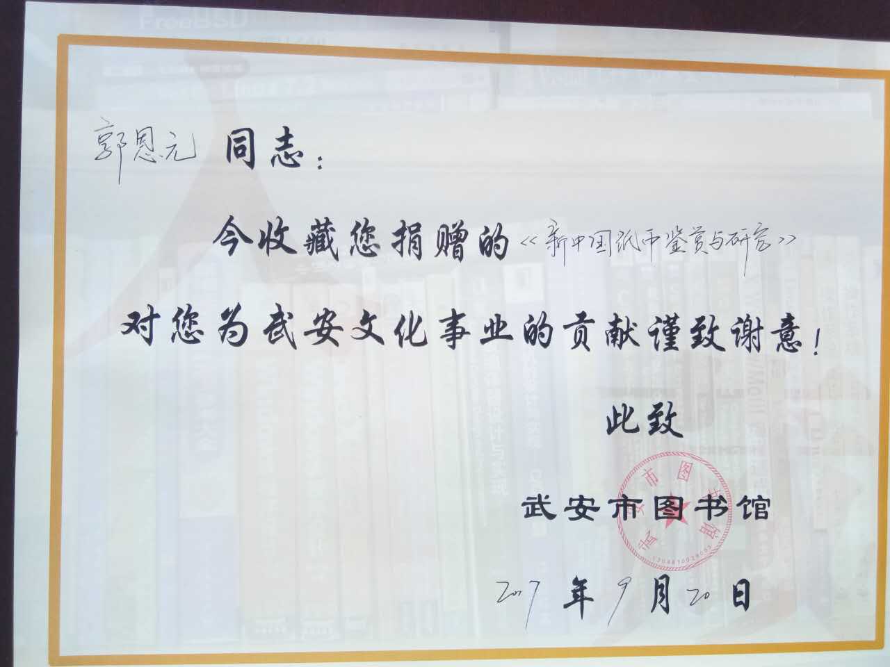 近日,由我公司董事長(zhǎng)郭恩元牽頭編纂的《新中國(guó)紙幣鑒賞與研究》一書,被武安市圖書館收藏。