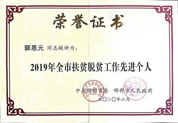 河北普陽鋼鐵集團(tuán)黨委書記、董事長郭恩元被授予“2019年全市扶貧脫貧工作先進(jìn)個人”榮譽(yù)稱號,是武安市唯一獲此殊榮的企業(yè)家。