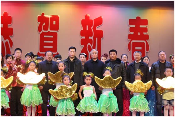 董事長郭恩元??偨?jīng)理石躍強,副總經(jīng)理郭強、曹立國、陳丹峰、王建安一起上臺與全體演職人員合影留念。