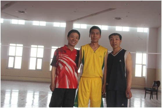2013年“迎五一”男子羽毛球冠、亞季軍合影。左起依次為:亞軍陳建國(guó)、冠軍李延龍和季軍任志學(xué)。